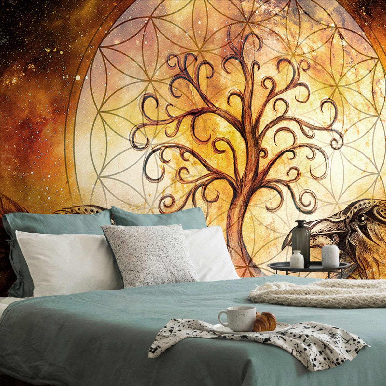 La carta da parati con il motivo dell'albero della vita magico porta armonia e mistero nel vostro interno. Al centro si erge un elegante albero, circondato da ornamenti e simboli, mentre ai lati si trovano uccelli stilizzati. I colori caldi come l'arancione, il marrone e l'oro evocano una sensazione di calma e connessione con la natura. Questa carta da parati è la scelta ideale per creare uno spazio accogliente e ispiratore, ad esempio nel soggiorno o nello studio. Realizzata con materiali di alta qualità, garantisce una lunga durata e una facile manutenzione.