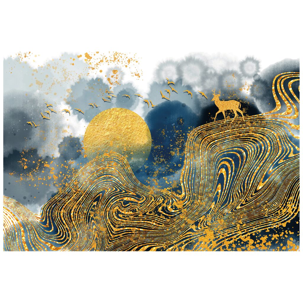 Carta da parati autoadesiva "Terra Magica" porta un affascinante motivo naturale con eleganti accenti dorati. In primo piano si trova un maestoso cervo, mentre sullo sfondo si estende una rappresentazione stilizzata del paesaggio con onde e sole. La palette di colori include tonalità di blu profondo e oro, creando un'atmosfera armoniosa e rilassante. Questa carta da parati è ideale per ravvivare il soggiorno o lo studio. Grazie alla sua tecnologia autoadesiva di alta qualità, è facile da applicare e resistente.