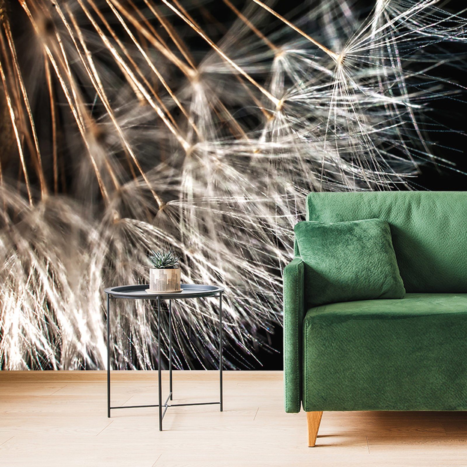Carta da parati con motivo di dente di leone cattura la delicatezza e la fragilità della natura. I dettagli delle fibre a ragnatela creano una texture affascinante su uno sfondo scuro. La combinazione di bianco e nero porta nell'ambiente un'atmosfera elegante e moderna. Questa carta da parati è ideale per rendere accogliente il soggiorno o lo studio. La qualità di stampa garantisce una lunga durata e una facile applicazione sulla parete.