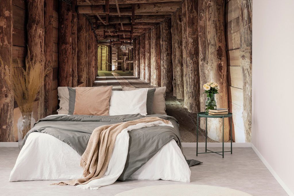 La carta da parati rappresenta una galleria di legno che evoca uno spazio accogliente e misterioso con pareti e pavimenti in legno. I dettagli, come le travi di legno grezzo e l'illuminazione delicata, creano un'atmosfera unica. Le calde tonalità di marrone e grigio evocano una sensazione di natura e tranquillità. Questa carta da parati è ideale per interni che necessitano di un tocco di originalità e bellezza naturale. Le nostre carte da parati sono realizzate con materiali di alta qualità, garantendo così una lunga durata e un'applicazione facile.