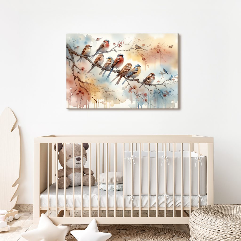 Il quadro su tela cattura un gruppo di uccelli posati su un ramo. Ogni uccello è rappresentato con dettagli delicati e diverse sfumature di colore che donano vita al soggetto. La palette di colori include toni caldi di marrone, blu e tenui pastelli, creando un’atmosfera serena e armoniosa. Questo quadro è ideale per ravvivare l'interno e porta un'eleganza naturale nello spazio. Il quadro è stampato su tela di alta qualità, garantendo lunga durata e un aspetto incantevole.