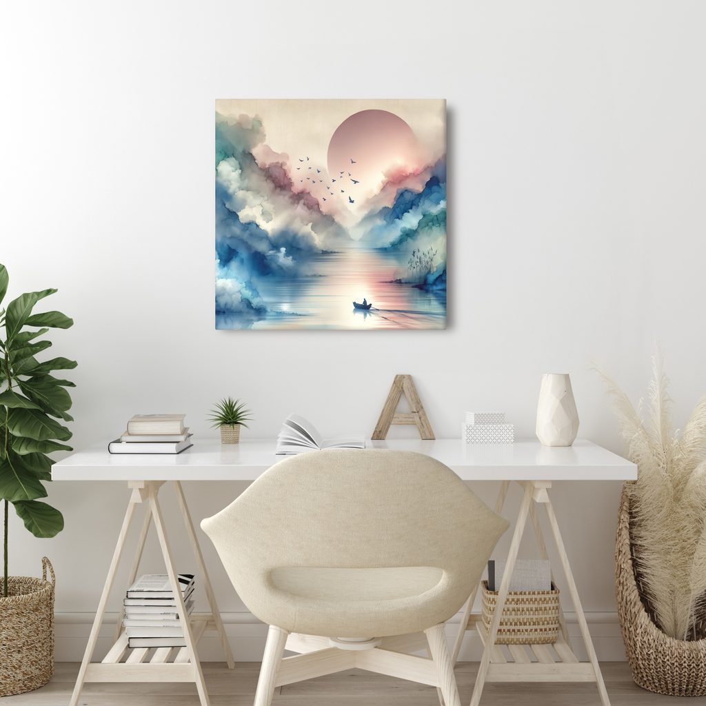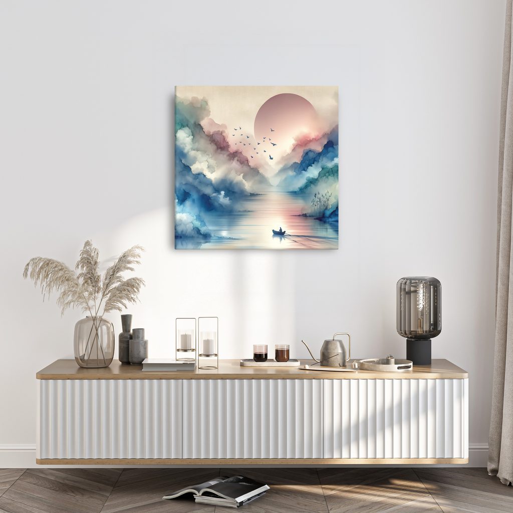 Il quadro su tela "Tocco del cielo e della terra" cattura l'armonia della natura e della tranquillità. Nel motivo vediamo una barca che naviga su acque serene, circondata da delicati nuvole blu-rosate e dal sole che sorge all'orizzonte. I colori sono rasserenanti e creano un'atmosfera di benessere e sogno. Questo quadro è la scelta ideale per abbellire gli interni, sia nel soggiorno che nello studio. La stampa di alta qualità su tela garantisce una lunga durata e vivacità dei colori.