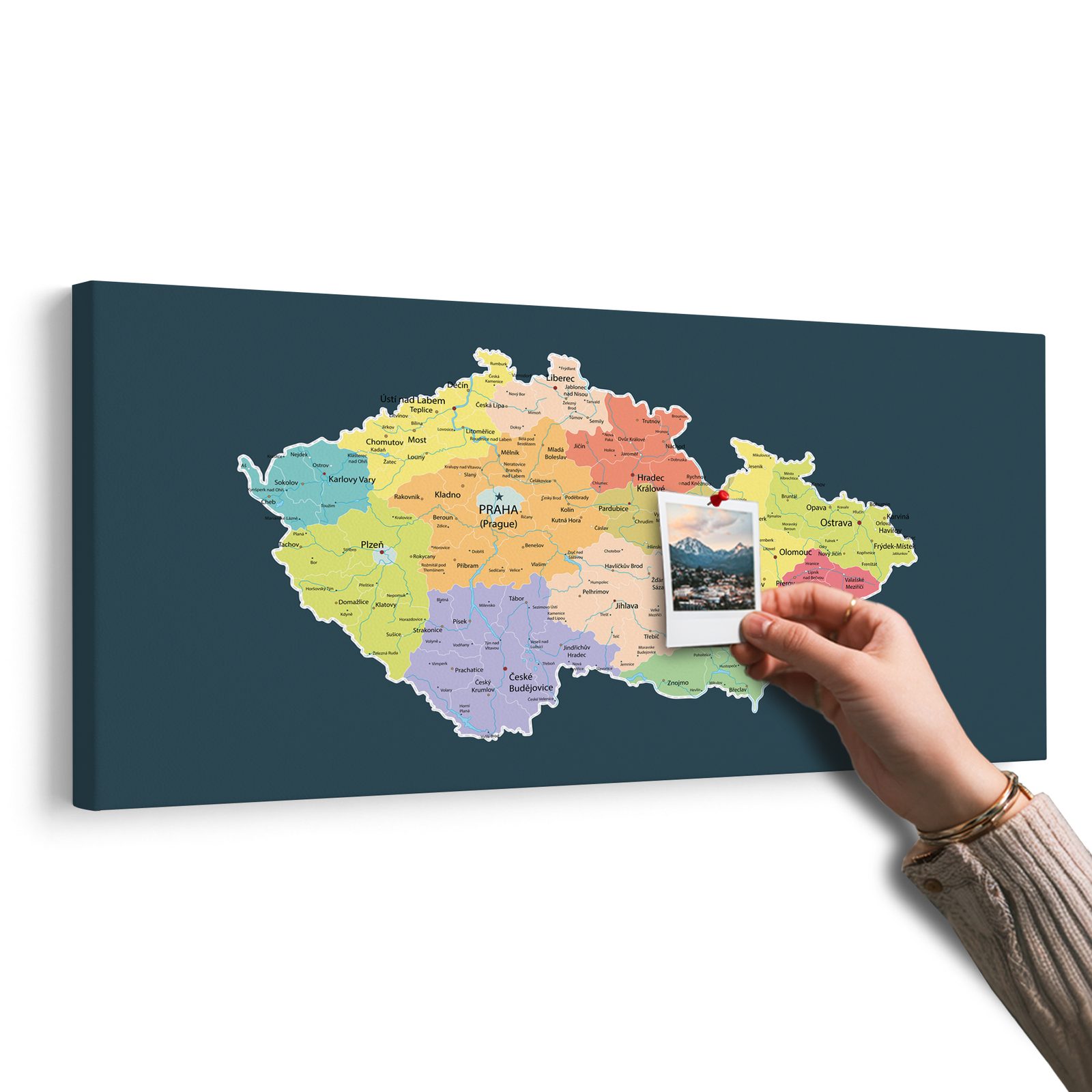 Quadro su tela in sughero con la mappa della Repubblica Ceca su uno sfondo scuro offre una visione unica del nostro paese. La mappa è suddivisa in diverse regioni con colori vivaci, rendendo facile l'orientamento e aggiungendo attrattiva visiva. Lo sfondo scuro crea un contrasto che mette in risalto i dettagli della mappa e le conferisce un aspetto moderno. Questo quadro è la scelta ideale per uffici, studi o come decorazione originale per il soggiorno. La stampa di alta qualità e l'uso del sughero garantiscono una lunga durata e una facile manutenzione del prodotto.
